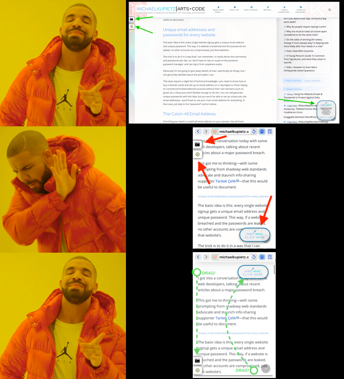 Here's why: as I loaded up my personal website Kupietz Arts+Code with all sorts of custom plugins and gewgaws, a number of html/javascript floating elements were added to it: a floating palette begging readers to hire me, and control tabs for my KupieTools Page Appearance Adjuster and "Expert Mode" CLI-based website navigation, with more to come. While these looked terrific on my computer screen, I soon discovered to my shock and horror that on my tiny, little iPhone SE screen, these added elements covered up vital page content.