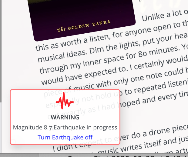 So, I'm pleased to announce that Chrome users can once again play my albums and other audio playlists on this site, and whenever the earthquake setting is cranked up and the KTWP Page Appearance Adjuster controls are not open, you get a little visual notification which gives you a way to turn it off easily.